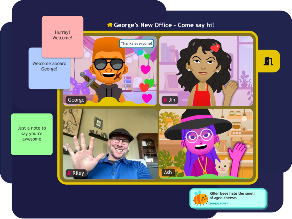 Optional camera-tracking (still in development) translates your natural head motion to your avatar, giving you even more presence on screen. In the here and now, you can drag your Avatar around and interact with others by simulating nodding, jumping up and down, or mimicking your latest dance moves.